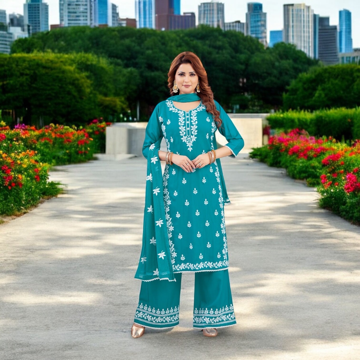 Introducing our curated set of kurta, pant, and dupatta! Perfect for any occasion, our set is beautifully embroidered and designed for both formal events and religious ceremonies. Expertly crafted for optimal comfort and elegance.