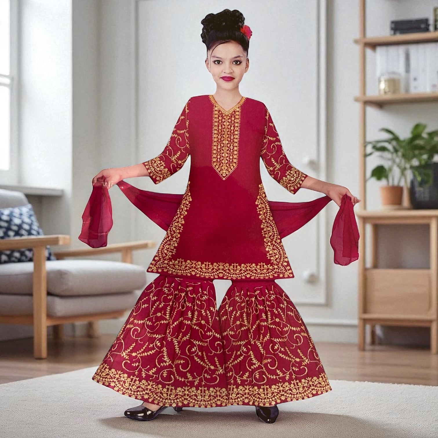 This skillfully designed Priya creations garara set is perfect for fancy occasions such as festivals, weddings, or any kind of functions. Its lightweight and vibrant look catches the eye of onlookers with ease. Elevate your style with this unique and eye-catching garara set.