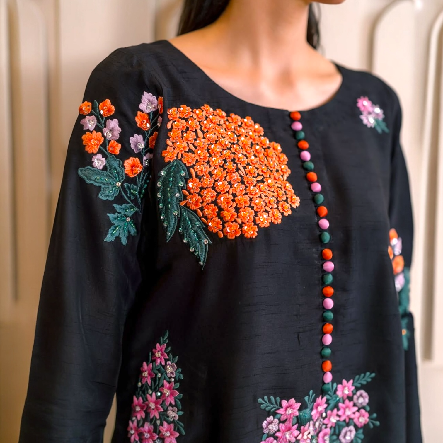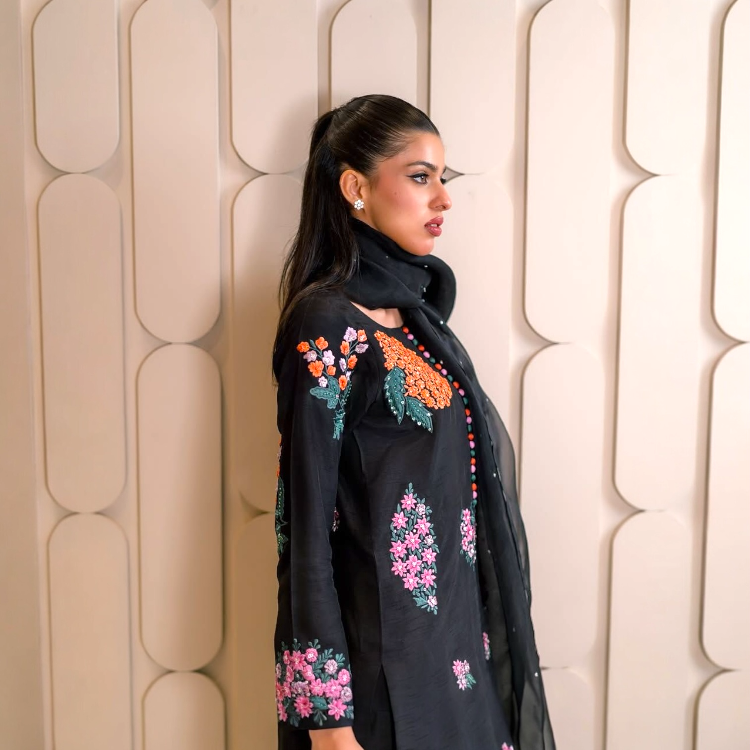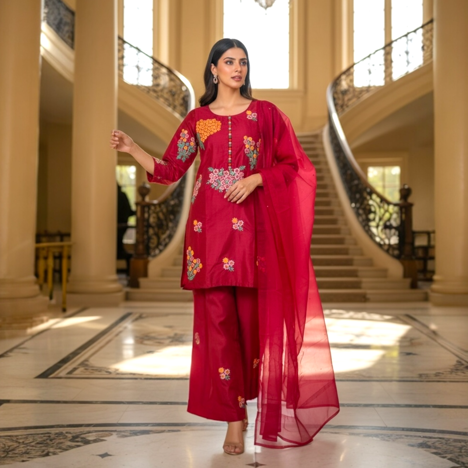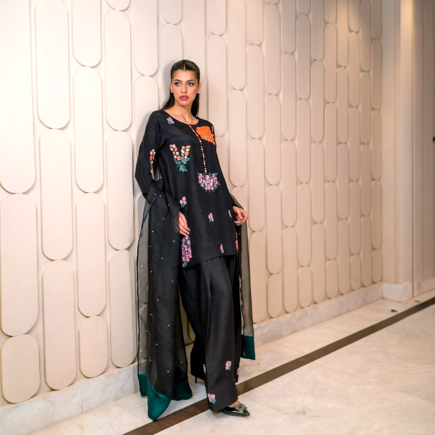 This Salwar Kameez comes with a unique farshi pant, providing a modern twist to traditional South Asian attire. Made with high-quality crepe silk fabric, this outfit is lightweight and comfortable for all-day wear. Channel your inner fashionista with this versatile and stylish ensemble.