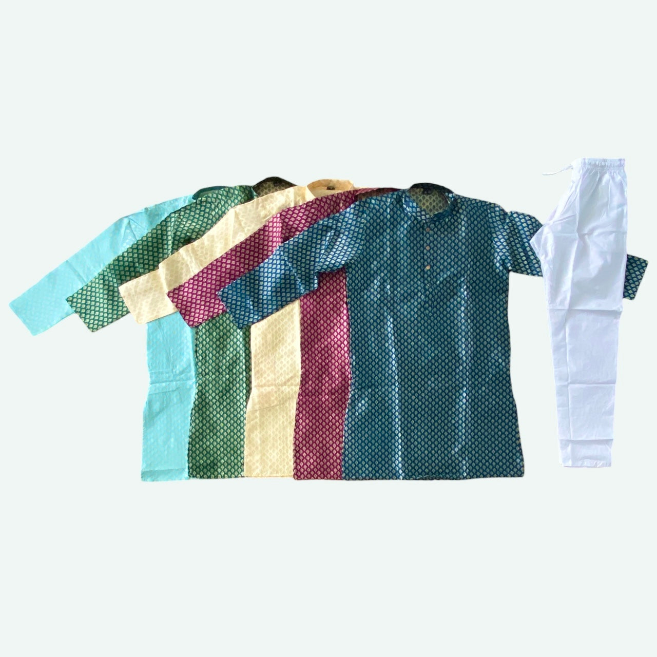 This kurta set is designed for easy and comfortable wear with an elastic waist and both side pockets in both the kurta and pants. The vibrant colors and lightweight material make it eye-catching and perfect for any occasion. Stay stylish and comfortable with this ankle length, elastic churidar kurta set.