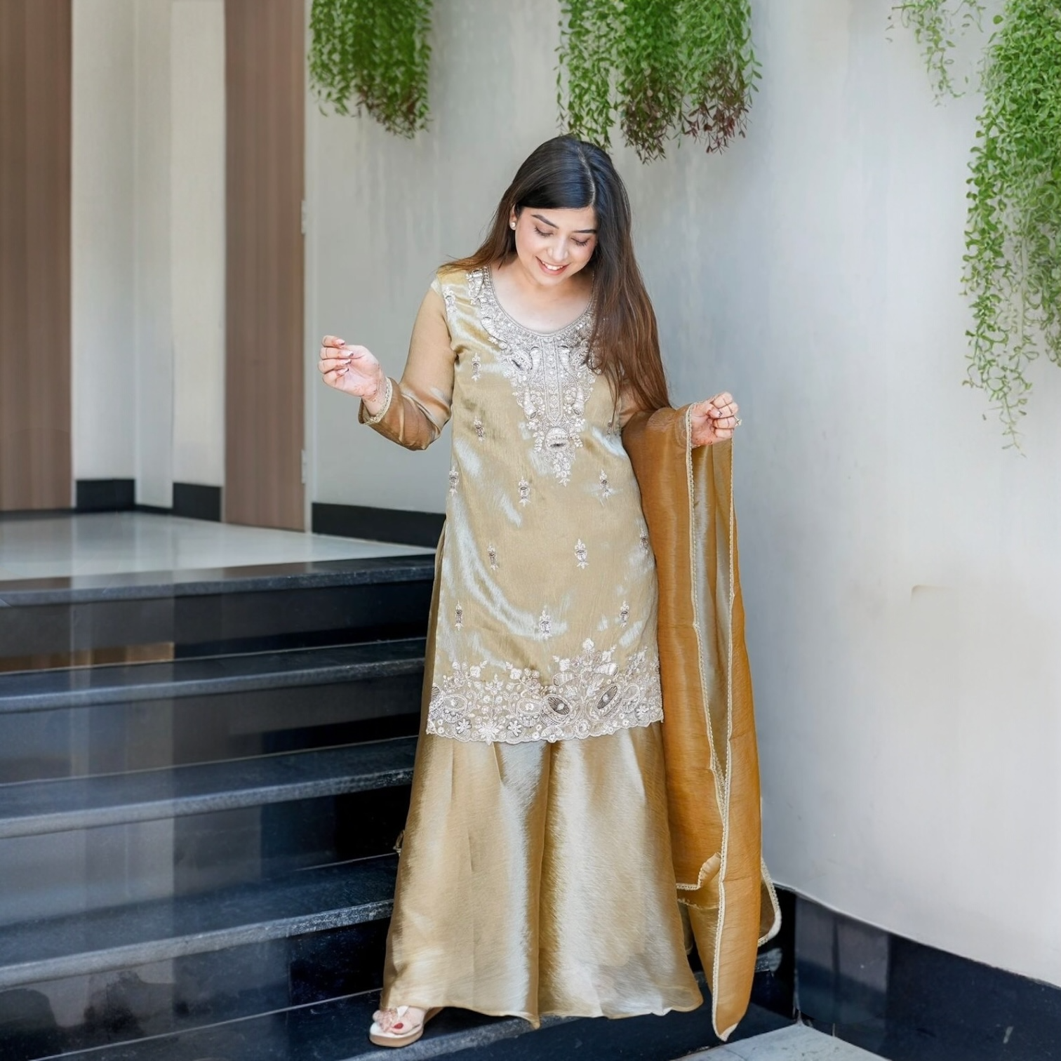 Introducing our Urmi Embroidered palazzo suit, designed with intricate embroidery for a touch of elegance. The palazzo pants provide both style and comfort, while the suit as a whole exudes sophistication. Made with high-quality materials to elevate your wardrobe.