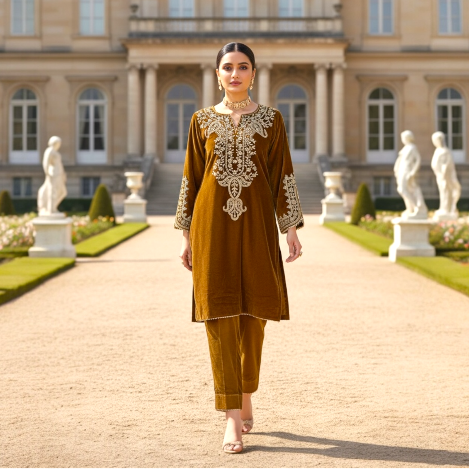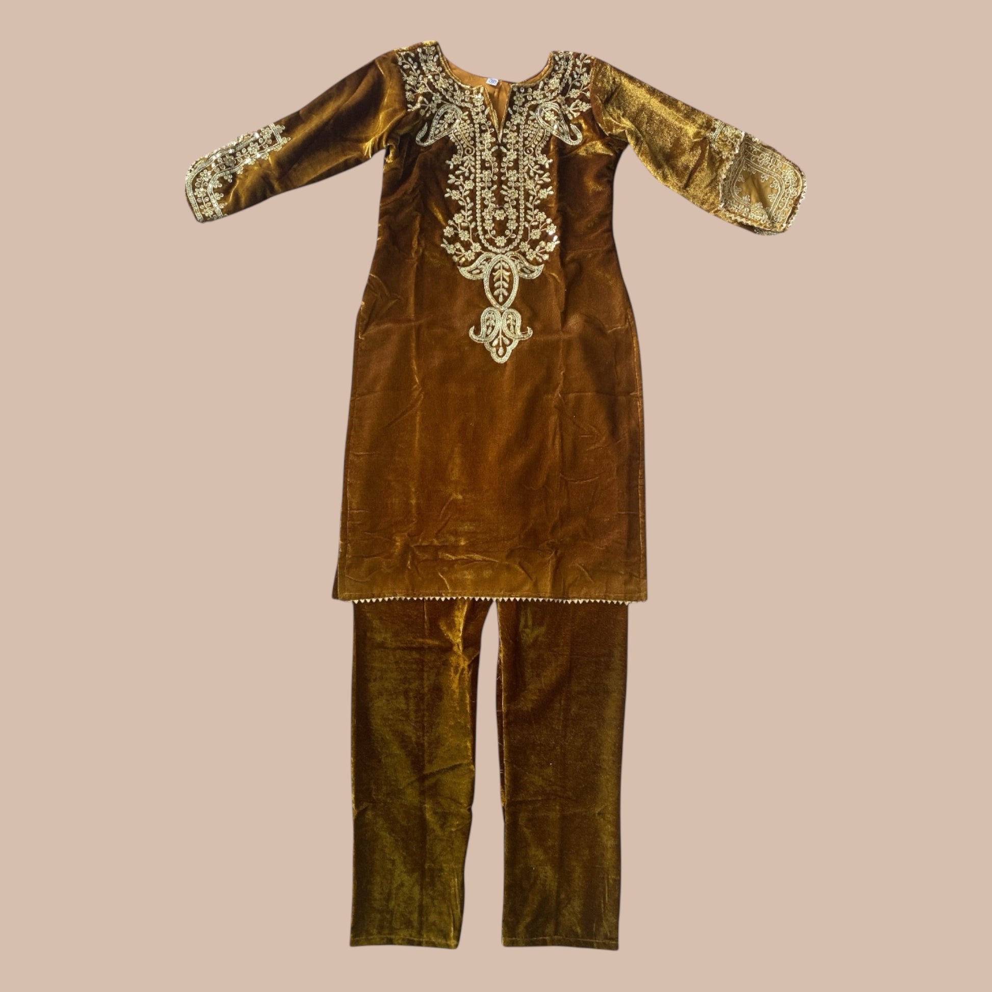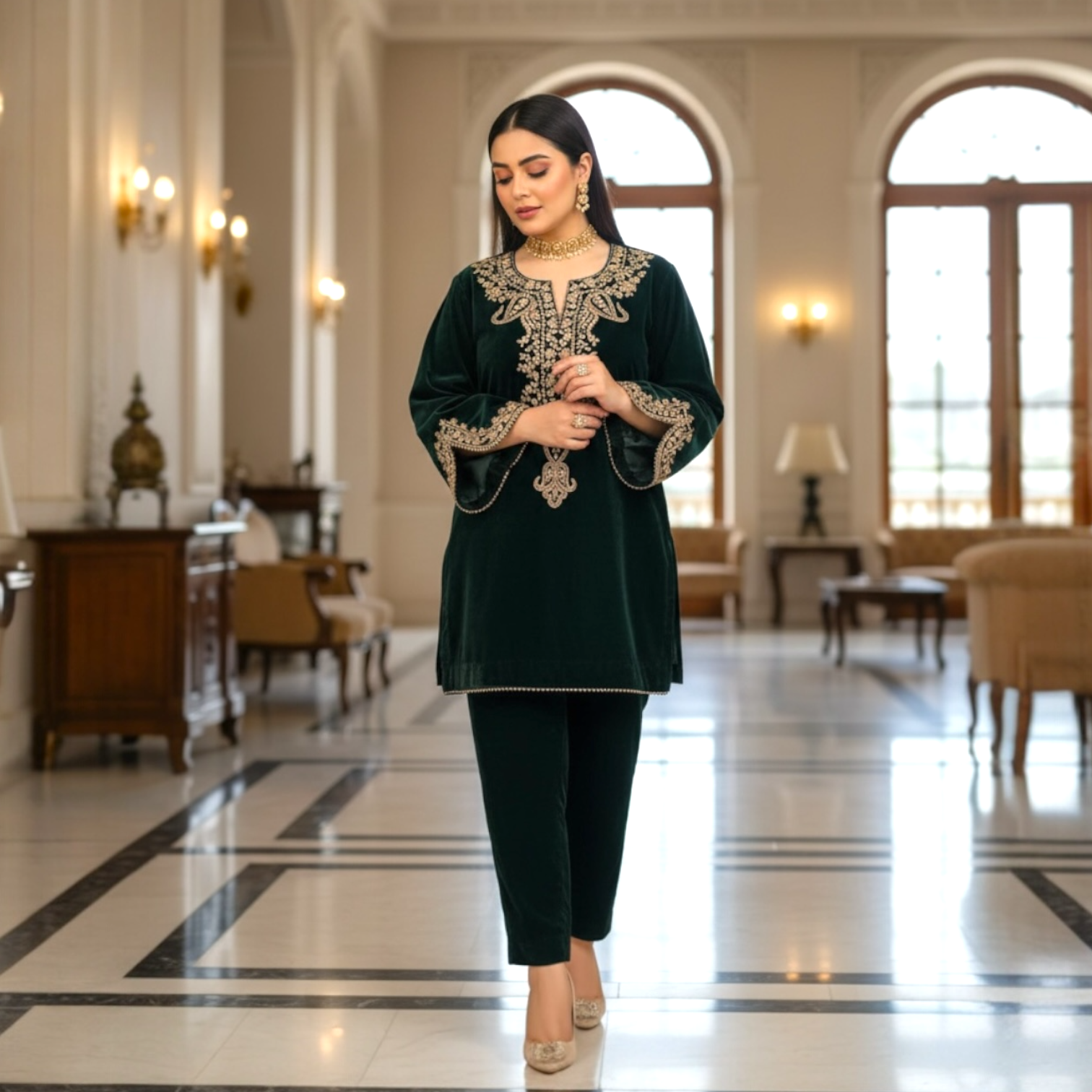 This Velvet Winter Co-ord Set is the perfect addition to your winter wardrobe. Made with luxurious velvet fabric, it will keep you warm and stylish all season. Featuring a matching top and bottom, it offers versatile options for any occasion. Upgrade your winter look with this must-have set.